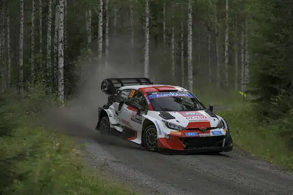 ToyotanKalle Rovanperäon aloittanut rajun hyökkäyksen Jyväskylän MM-rallissa lauantaina ja suomalainen taistelee nyt rallin voitosta.